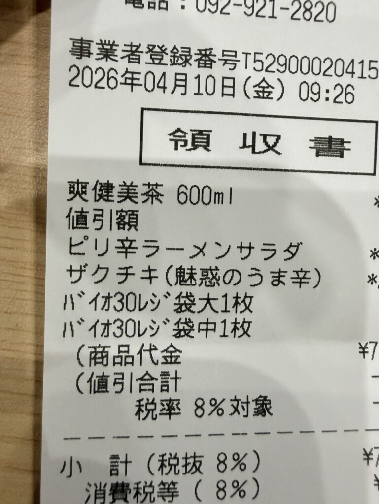 新人君だったのかな、、何か戸惑いながらレジをぽちぽちしてたので、レシート確認したらレジ袋が2つ登録されているではありませんか。