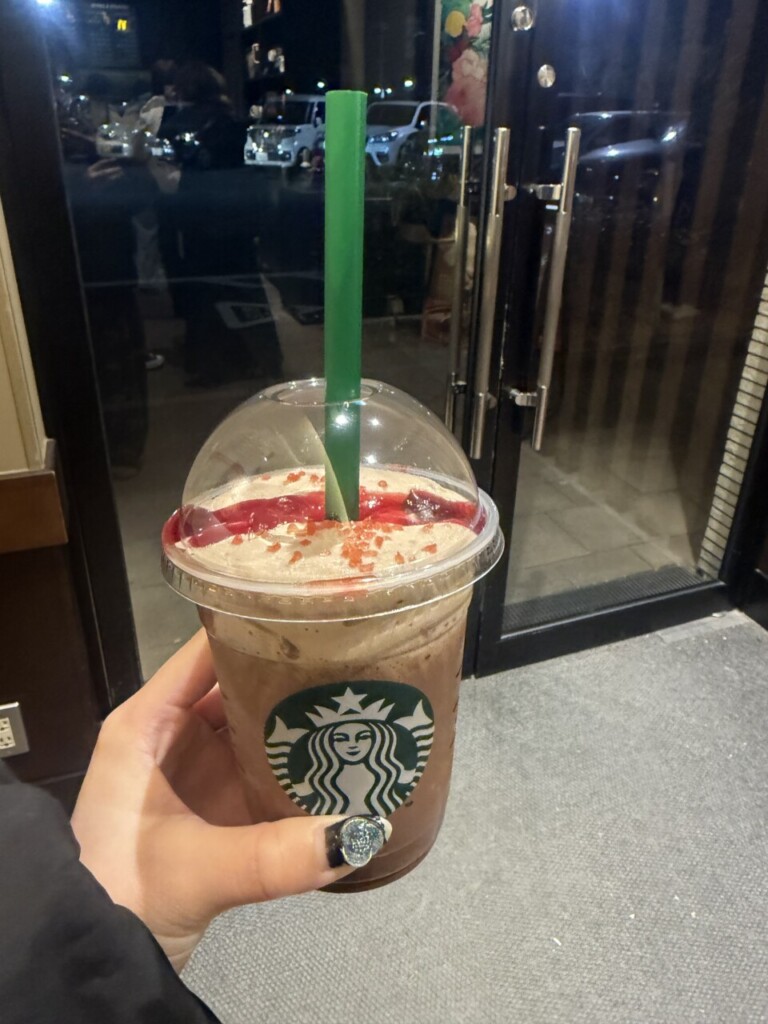 この前スタバの新作を飲みました☕️✨カカオとストロベリー🍓のフラペチーノにしてみました!もうフラペチーノを一人で1杯飲めなくなっていたので相方とふたりで1個にしました笑