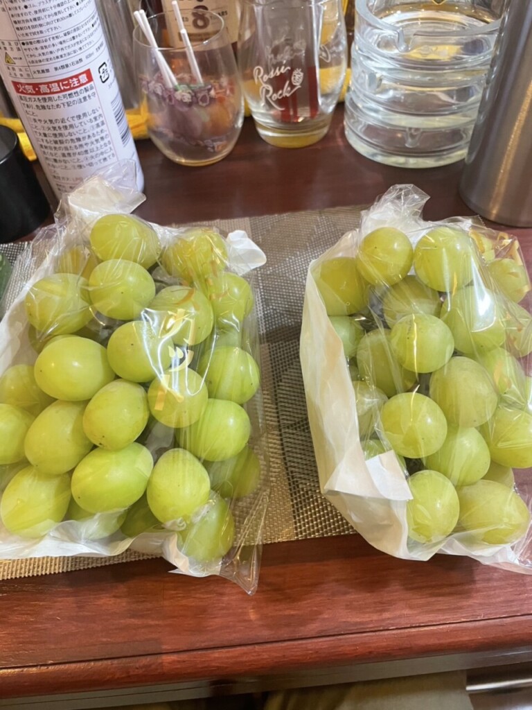 はたえはこの土日久留米に行ってきました😊そこでよく行くbarでシャインマスカットを頂きました!しかも2房も!!シャインマスカット大好き!!ありがとうございます。🥰パフェもいいし、タルトにしてもいいかなとも思っております!けど、一人では食べきれないので会社におすそ分けしようかなあ、、🤔