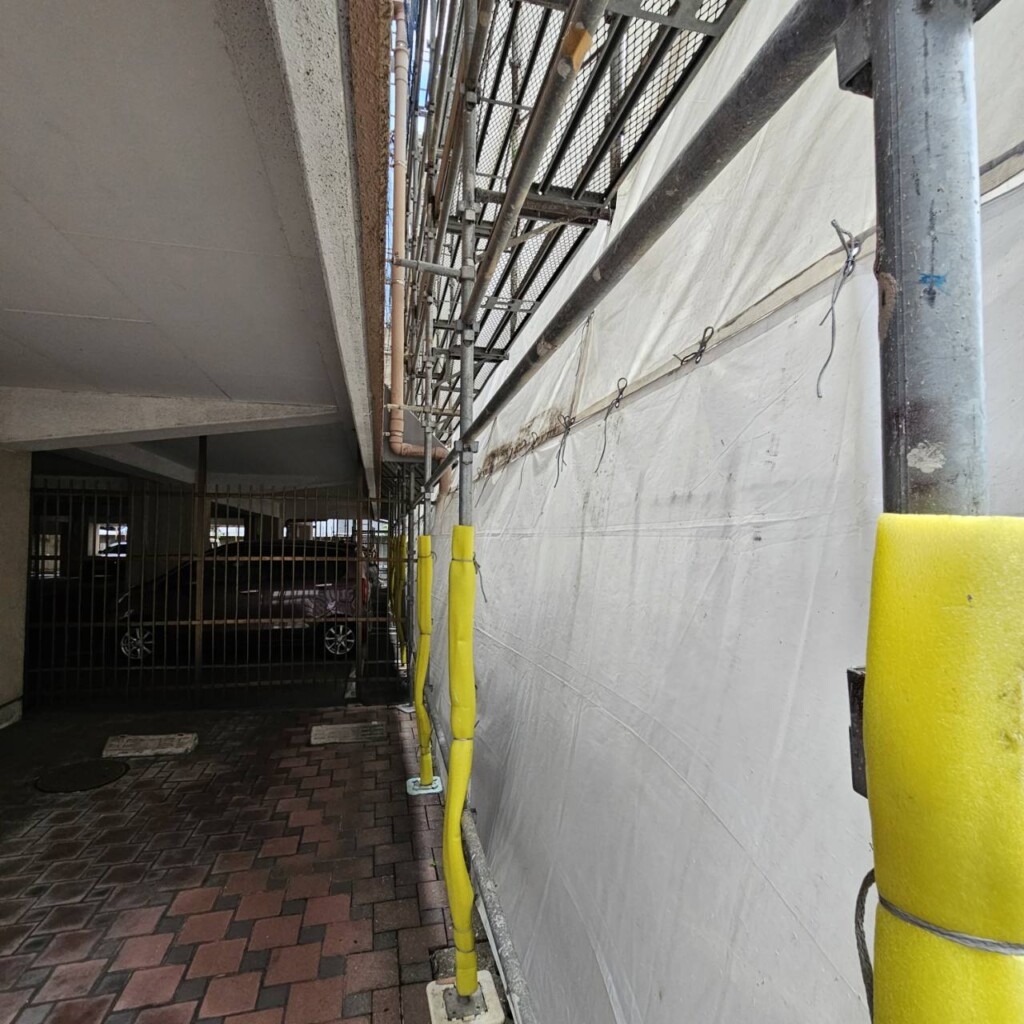 塗料の汚れや粉塵等がかからないよう対策をし足場を組立てていきました。