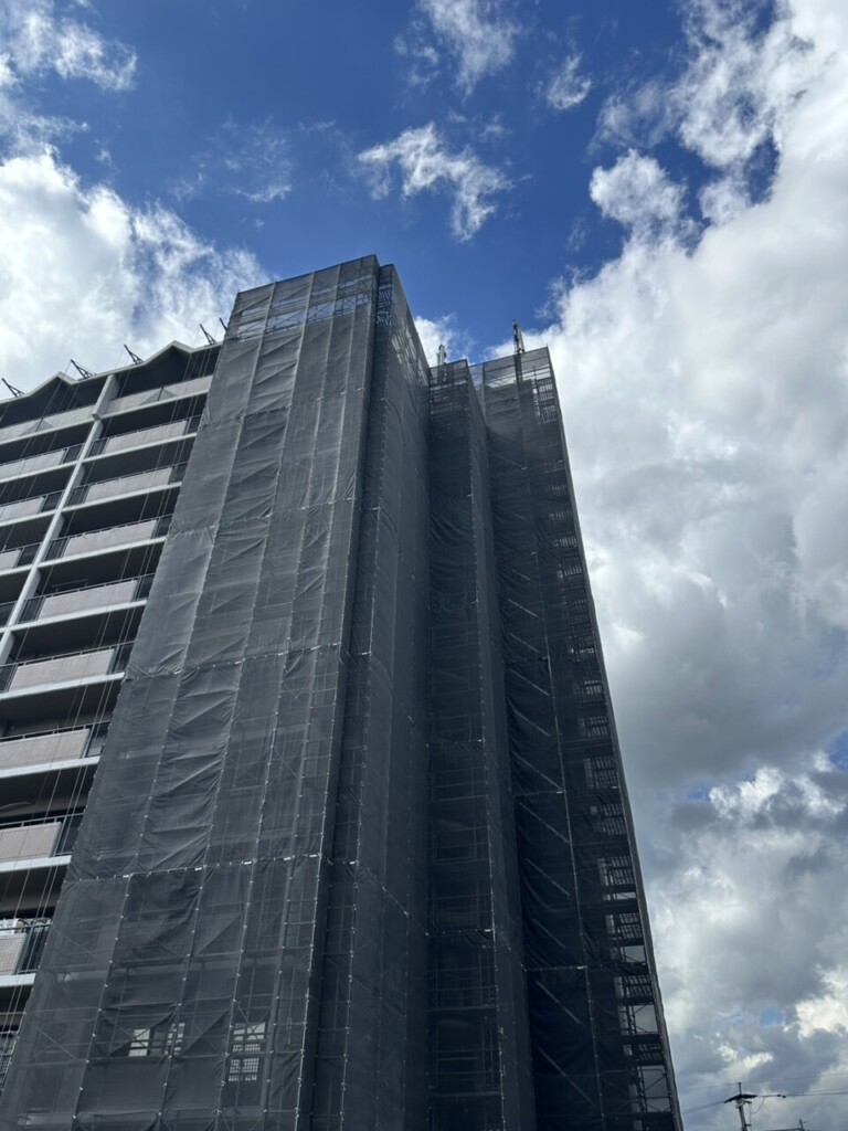 足場組立はマンション両妻面に組立を行う事になり今回は高層の為