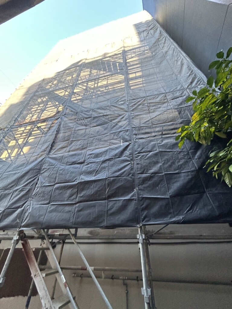 隣地との部分には飛散防止をより配慮する為防炎白シートを使い
