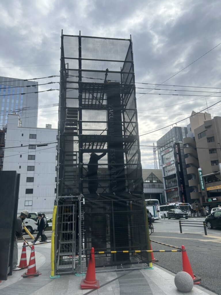 今回は某ビルのエントランス付近にある看板の足場の組立を行いました。