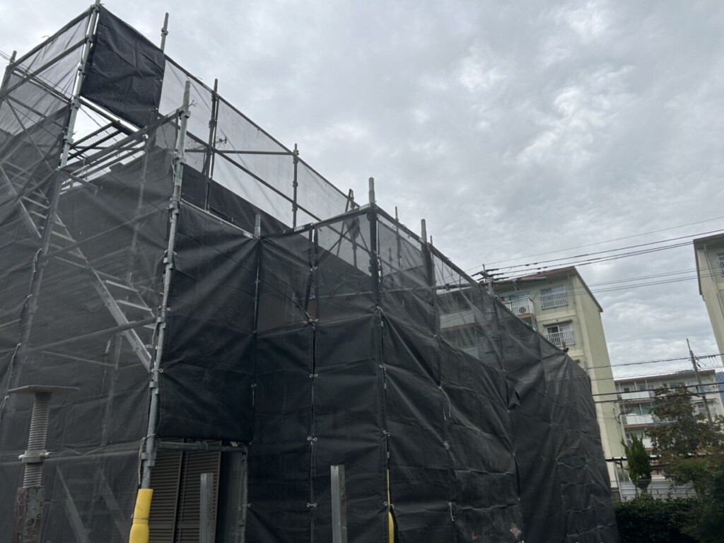 今回は屋根も塗装という事で飛散防止の為養生を上げ気味にし