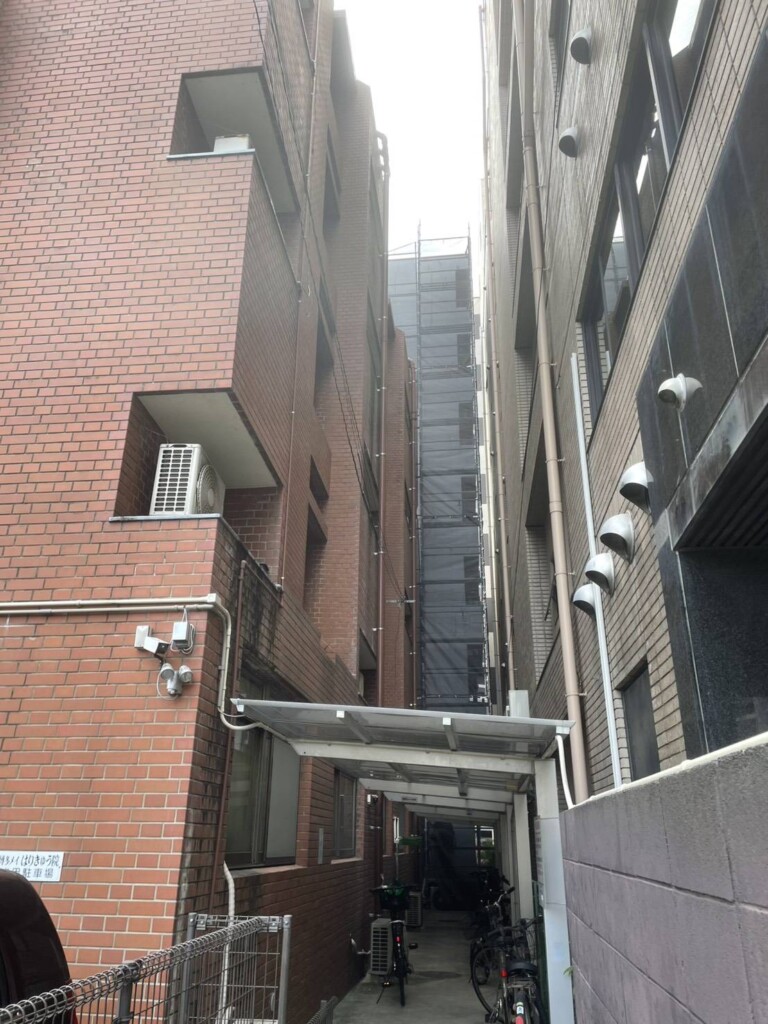 隣の建物との隙間もなく部分的に手摺組等を行い足場組立を