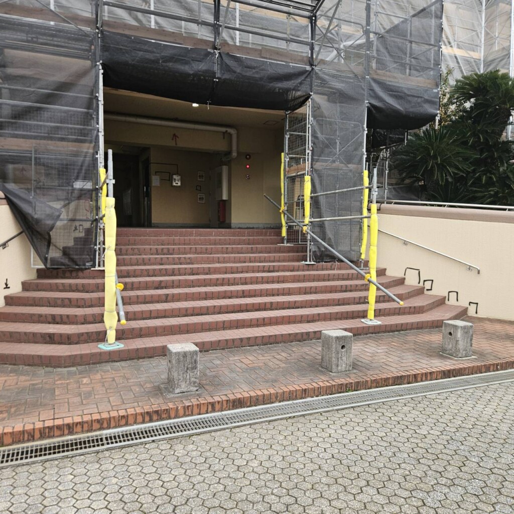 第三者災害が起きないよう対策をし必要な箇所には仮設で階段の手摺を