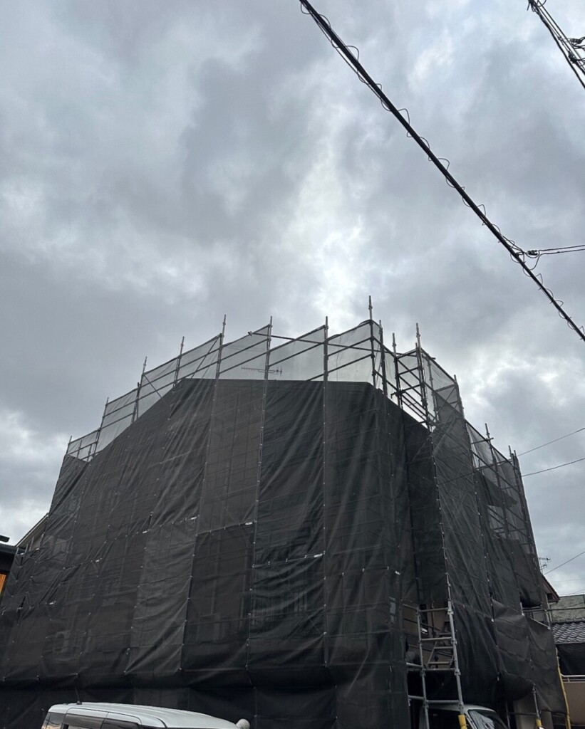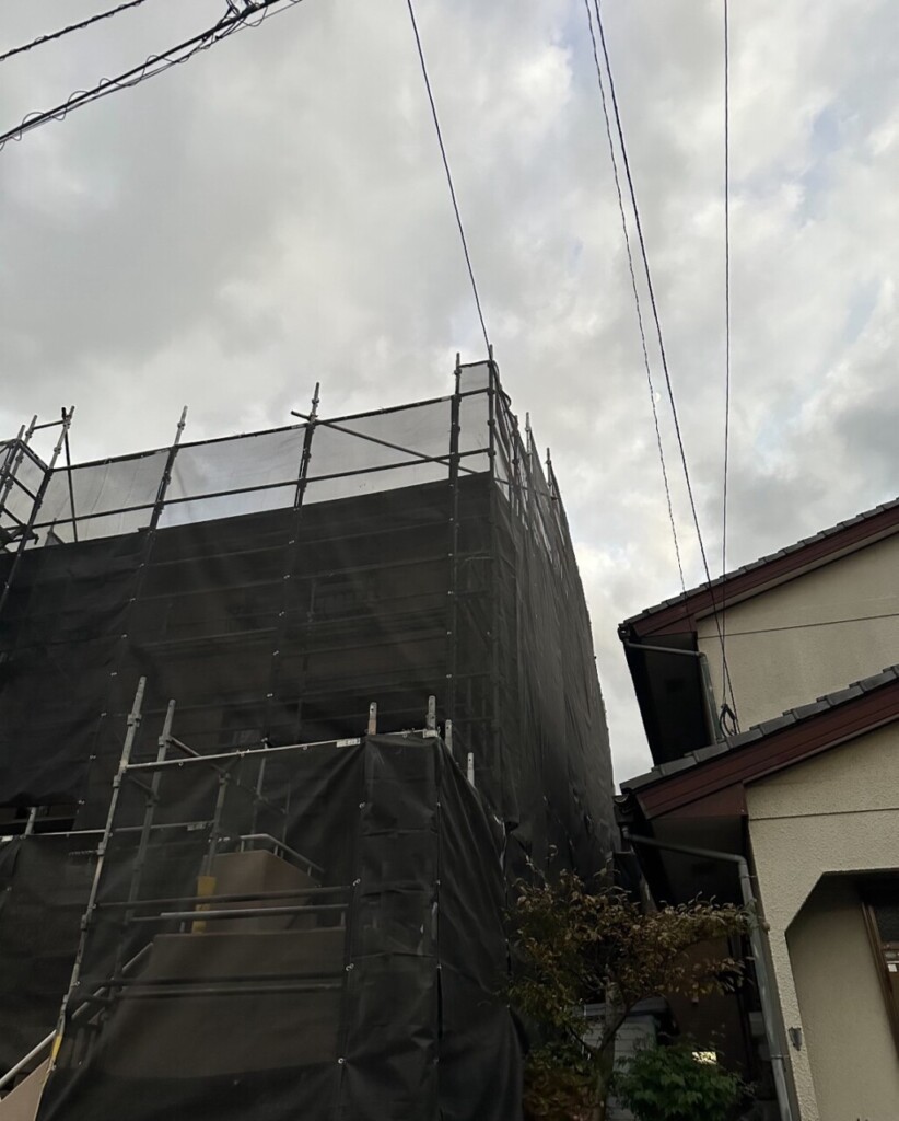ハーフ板等を使い敷地から出ないよう足場組立を進めていき
