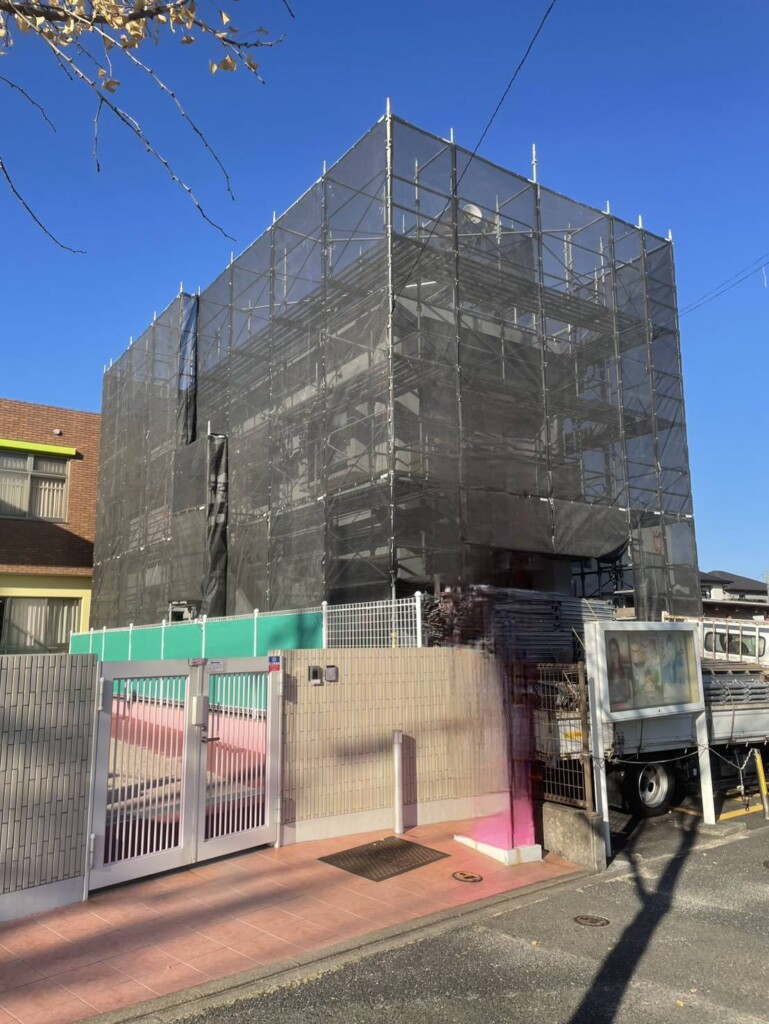 今回お隣が保育園ということもあり、組立中足場の近くに園児が来ないように配慮して頂いたため、
