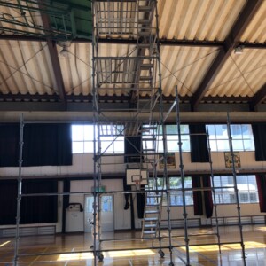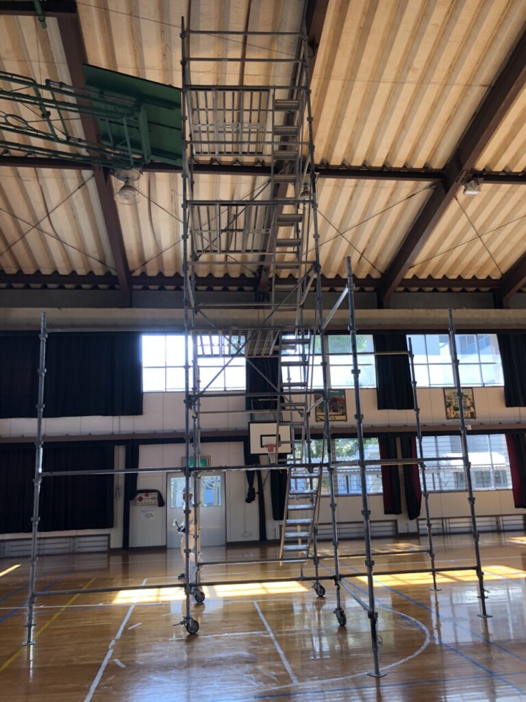 工事内容としては小規模ではありますが体育館の天井部分ということもあり、段数が高かったためローリングのみでは倒壊の恐れもある為アウトリガーを四方に取り付け倒壊対策を取らせて頂きました。