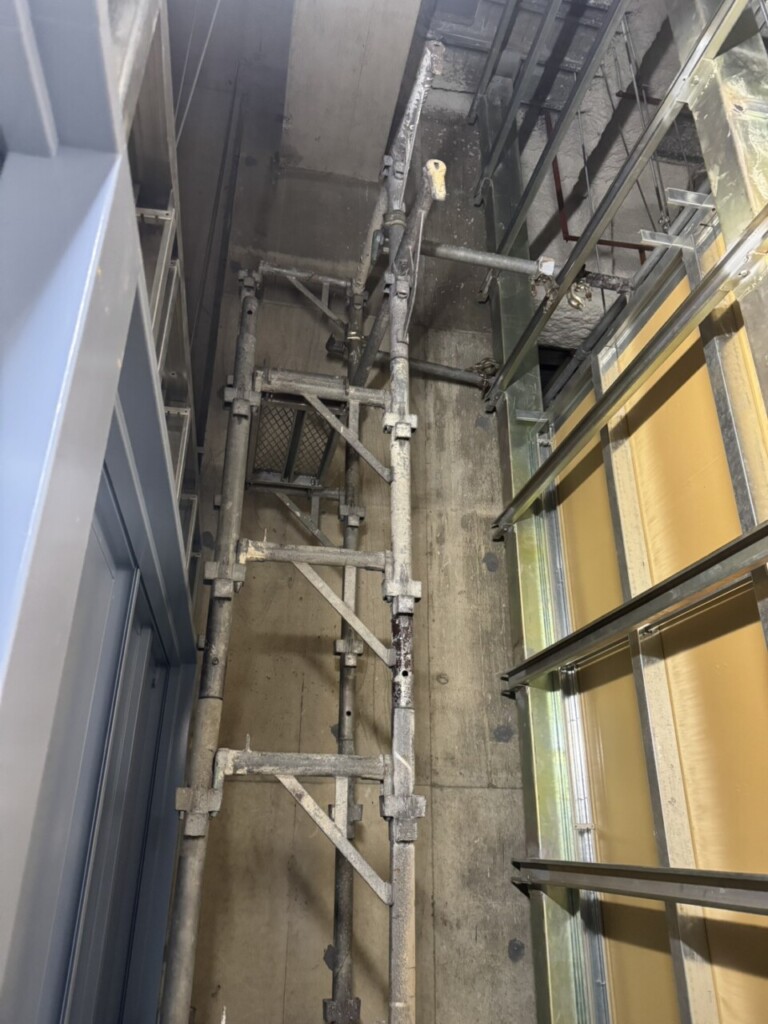 足場の割り付けも機械がある中での作業でしたので、慎重に組立を進め安全ガードを巻いた状態で万が一当たっても傷つかないように配慮しながら組立を行い、昇降階段を付けるスペースがなかった為ブラケットで昇降できるように安全ブロックを取付け上り下りできる状態にしています。