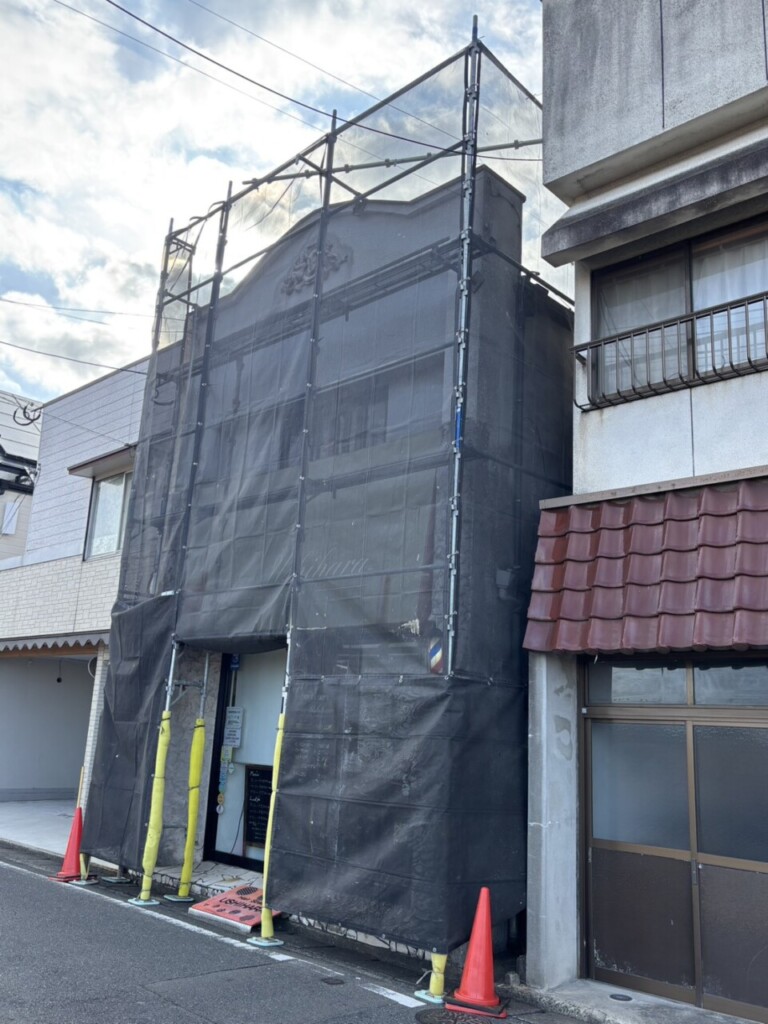 今回の物件は1面のみの組立で敷地がなく、足場が道路上にはみ出す為道路占用許可を事前に取り、組み立てを進めていった現場になります。