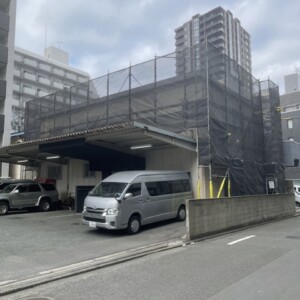 組み立てに関しまして正面以外の3面は敷地が狭く越境しないように地組の段階で壁から足場までの離れを設定し割付を考えることで越境せずに組み立てを進めることができました。