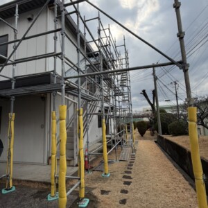 足場の補強といたしましてアウトリガーと挟み込みを取らせて頂き倒壊防止に努め、飛散防止用のシートは風が強く折半屋根の取替の為資材の搬出入がしづらいといううこともあり、今回は取り付けずに組立を完了した現場になります。