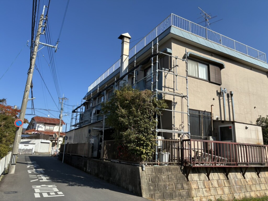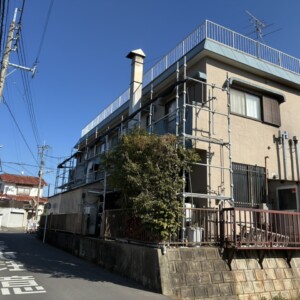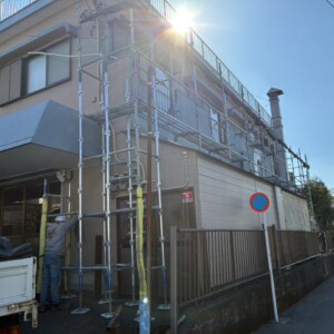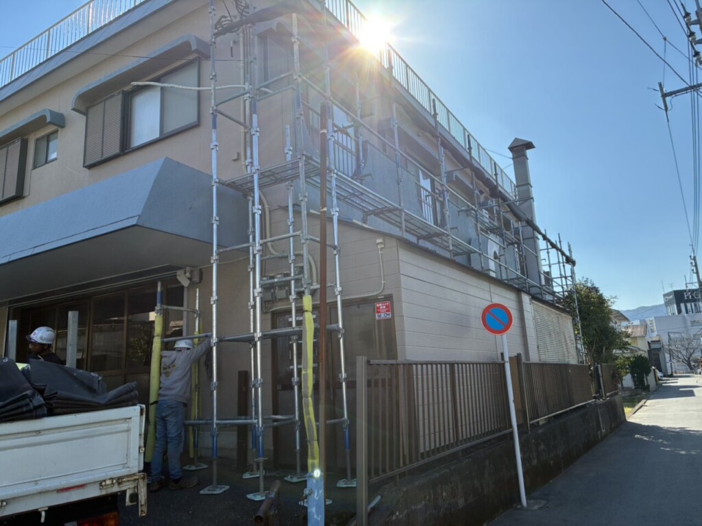足場の補強といたしましては足場つなぎを取ることができなかった為、挟み込みを取り付け飛散防止用のシートに関しては、養生をして取り付け作業時職人さんに取り付けて貰うように致しました。