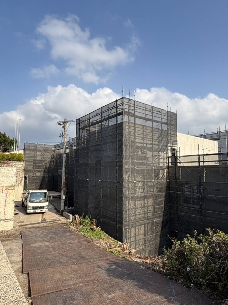 外部足場に関してはALC専用のアンカーを使用し足場つなぎを取り付け倒壊防止に務め最後に飛散防止用シートを取り付けて作業を完了した現場になります。