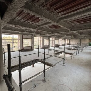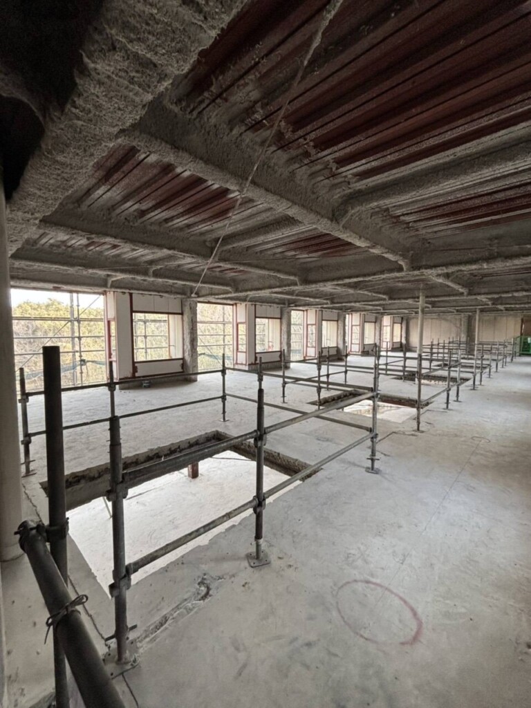 今回は内部の開口部分に落下防止手摺を取り付け外部では追加工事のための改修用足場の組立を行いました。