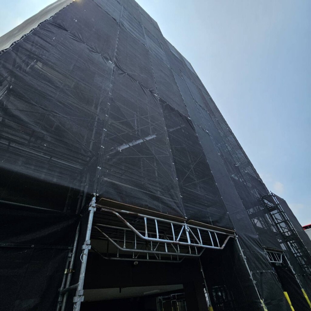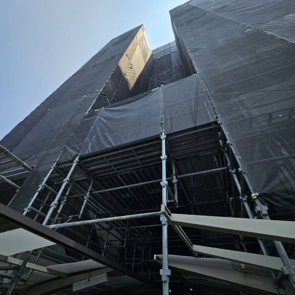 この物件は正面はゴンドラで残り3面を足場で組立をさせていただきました。