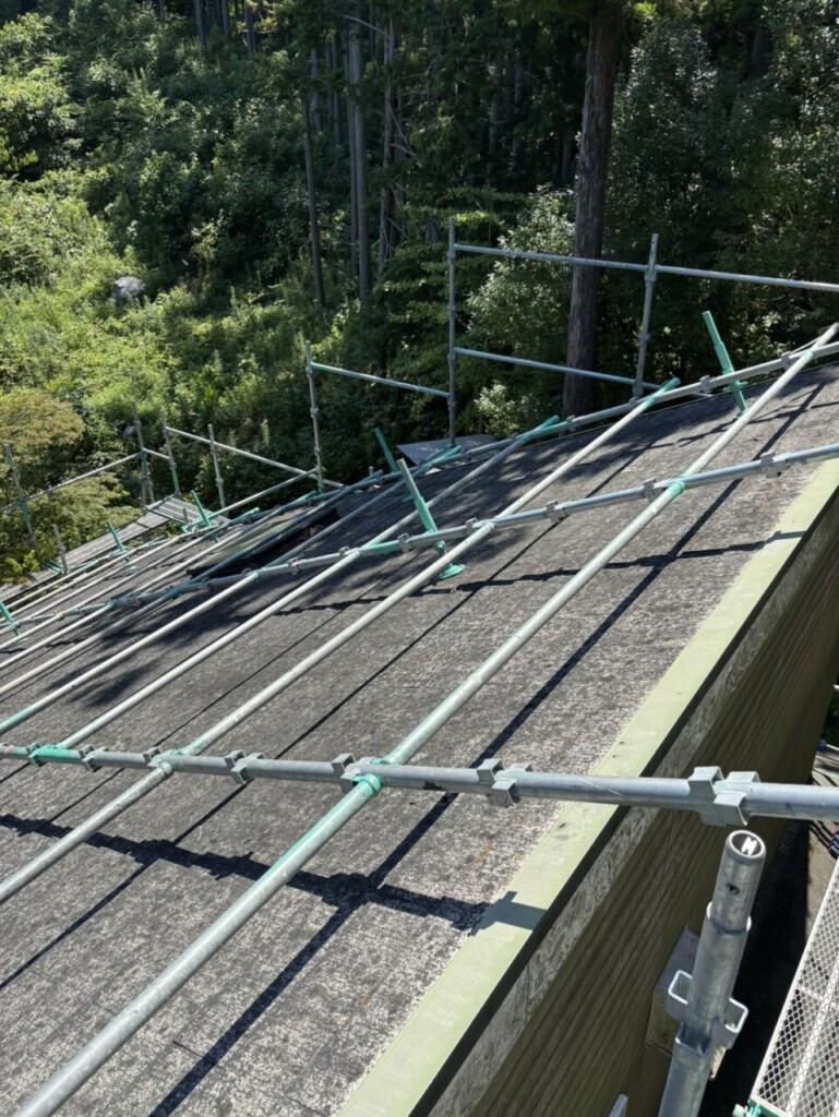 屋根勾配もきつく今回は屋根足場までの組立を行いました。